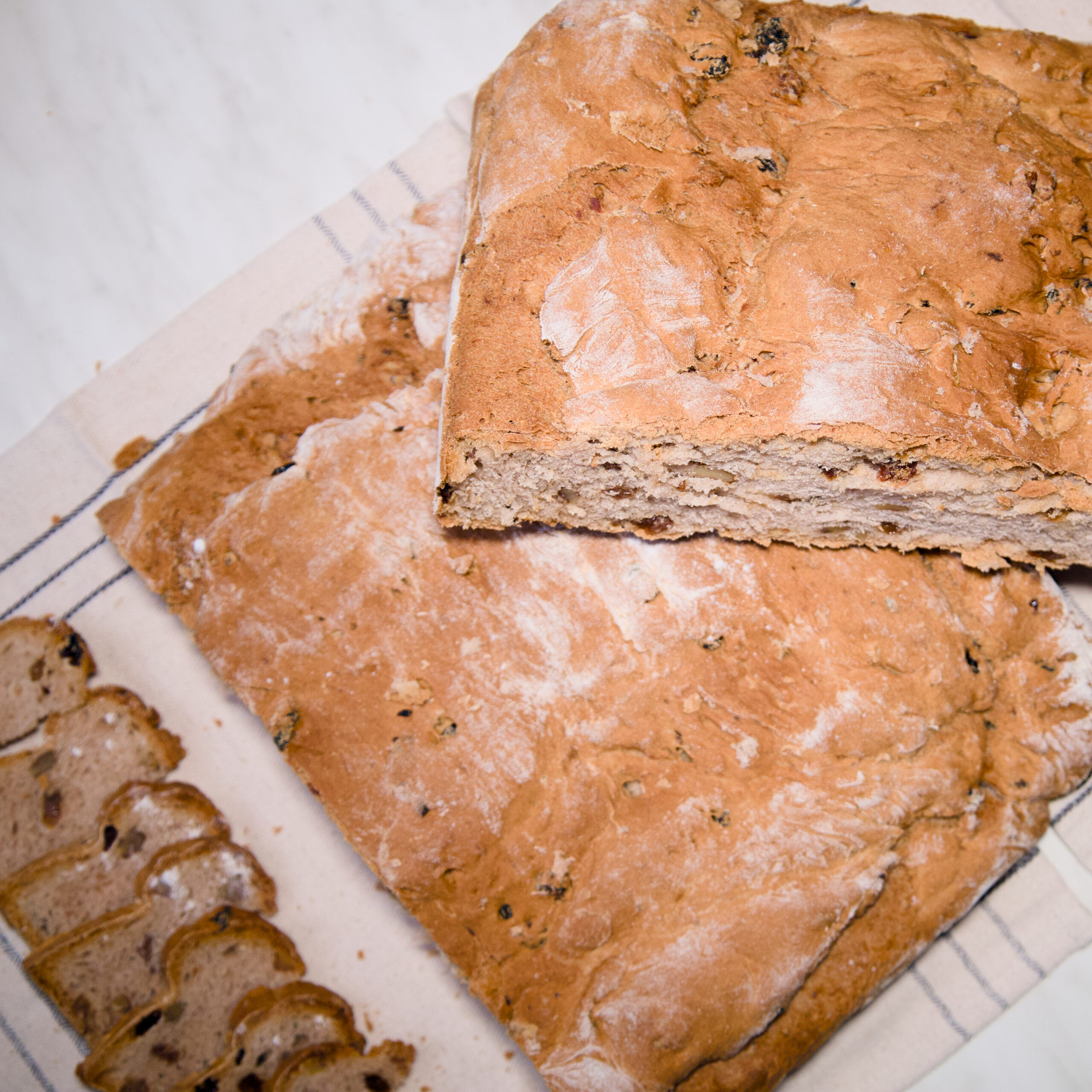 Nuestra receta contiene agua, sal harina de trigo, levaduras de pan, pasas y nueces.